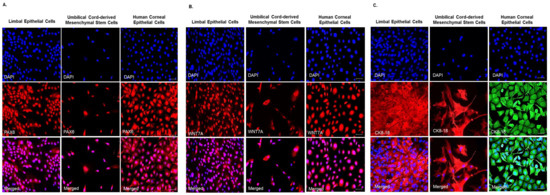 The WNT7A is reported to regulate corneal epithelial differentiation through the transcription factor PAX6. The WNT7A-PAX6 axis has a central role in fate determination of corneal epithelial cells [41]. To study the inherent potential of UC-MSCs to differentiate into cells of corneal epithelial lineage, we studied the expression of PAX6, WNT7A and CK8/18 in the UC-MSCs, corneal (HCE) and limbal epithelial (LECs) cells through immunofluorescence. UC-MSCs, along with HCE and LECs, showed the expression of ocular surface developmental marker PAX6 (Figure 3A), signaling molecule WNT-7A (Figure 3B), and epithelial marker CK8/18 (Figure 3C).