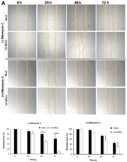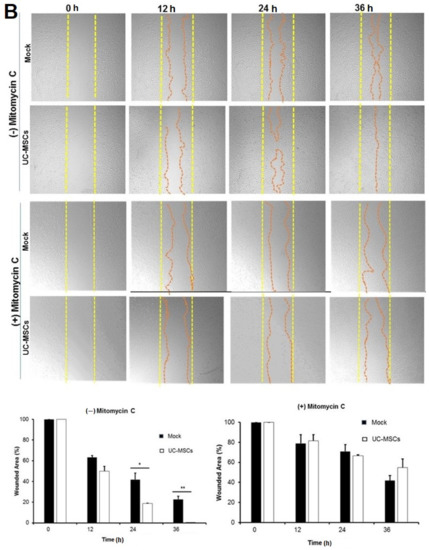 On the other hand, Mitomycin C-treated corneal epithelial cells showed significantly reduced rate of wound closure compared to untreated cells. Moreover, addition of UC-MSCs to Mitomycin C-treated epithelial cells couldn’t change the rate of wound closure significantly (Figure 4A,B). Relative to mock (Mitomycin C-treated corneal epithelial cells), UC-MSCs showed increase in rate of epithelial wound closure in SIRC (at 24 (96.21 ± 11.73% vs. 87.53 ± 1.5%), 48 (73.47 ± 3.94% vs. 56.78 ± 17.53%) and 72 h (44.90 ± 5.98% vs. 31.62 ± 16.44)) and HCE (at 24 h (71 ± 6.73% vs. 66.7 ± 9.3%)) cells (Figure 4A,B), respectively.