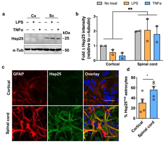 Hsp25 expression in LPS- or TNFα-stimulated primary cortical and spinal cord glial cultures. (a) Mixed primary cortical (Cx) and spinal cord (Sc) glia were treated with 80 µg/mL LPS or 100 ng/mL TNFα for 24 h. 30 µg of total protein was immunoblotted and probed for Hsp25 (25kDa) and α-tubulin (50 kDa). (b) Fold change in Hsp25 band intensity relative to the untreated cortical sample and normalised to α-tubulin to account for differences in protein loading. Data presented are the mean ± SEM from three biological replicates. Statistically significant differences between the means were assessed using a two-way ANOVA followed by Bonferroni’s post hoc test. (c) Representative images of untreated cortical and spinal cord glial cultures immunolabelled for GFAP (astrocytic marker; left) and Hsp25 (middle). Overlay (right) is shown with DAPI nuclear stain. Scale bar = 30 µm. (d) The proportion of Hsp25+ve astrocytes from cell counts of cortical and spinal cord glial cultures. Data shown are from one biological replicate and are the mean ± SEM of >300 cells across five wide field of view images. Statistically significant differences between the means were assessed using Student’s t-test, where p < 0.05 (*), p < 0.01 (**).