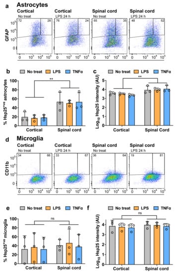 Flow cytometric analysis of Hsp25 expression in astrocytes and microglia after LPS and TNFα treatment. Primary cortical and spinal cord mixed glial cultures were treated with 80 µg/mL LPS or 100 ng/mL TNFα. The cells were fixed, permeabilised and immunolabelled for GFAP-Cy3, CD11b-APC/Cy7 and Hsp25-AF488. (a,d) Flow cytometric analysis of cortical and spinal cord glial cultures. Left–right: Representative cytograms of untreated and LPS treated cortical glial cultures, and untreated and LPS treated spinal cord cultures. Data are presented as pseudo-colour scatter plots where blue represents low and red represents a high frequency of cells. The percent of GFAP+ve or CD11b+ve cells in each gate is provided. (b,e) The percent of Hsp25+ve astrocytes or microglia as determined from the flow cytometric analysis. (c,f) The Hsp25-AF488 fluorescent median of the astrocytic or microglial population in arbitrary units (AU). Data shown are the means ± SEM of three biological replicates. Differences between the means were determined using a two-way ANOVA followed by Bonferroni’s post hoc test, where p < 0.01 (**).