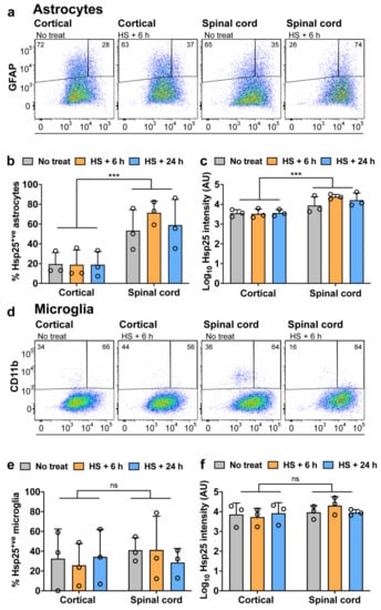 Flow cytometric analysis of Hsp25 expression in astrocytes and microglia after heat shock. Mixed primary cortical and spinal cord glia were heat shocked at 42 °C for 30 min and allowed to recover at 37 °C for 6 or 24 h. Cells were then fixed, permeabilised, immunolabelled for GFAP-Cy3, CD11b-APC/Cy7 and Hsp25-AF488 and analysed by flow cytometry. (a,d) Flow cytometric analysis of cortical and spinal cord glial cultures. Left–right: Representative cytograms of untreated and heat shocked cortical glial cultures, and untreated and heat shocked spinal cord cultures. Data are presented as pseudo-colour plots where blue represents low and red represents a high frequency of cells. Outlier events are shown as individual black dots. The percent of GFAP+ve or CD11b+ve cells in each gate is provided. (b,e) The percent of Hsp25+ve astrocytes or microglia as determined from the flow cytometric analysis. (c,f) The median of the Hsp25-AF488 fluorescence intensity of the astrocytic or microglial population. Data shown are the means ± SEM of three biological replicates. Potential differences between the means were assessed using a two-way ANOVA followed by Bonferroni’s post hoc test, where p < 0.001 (***).