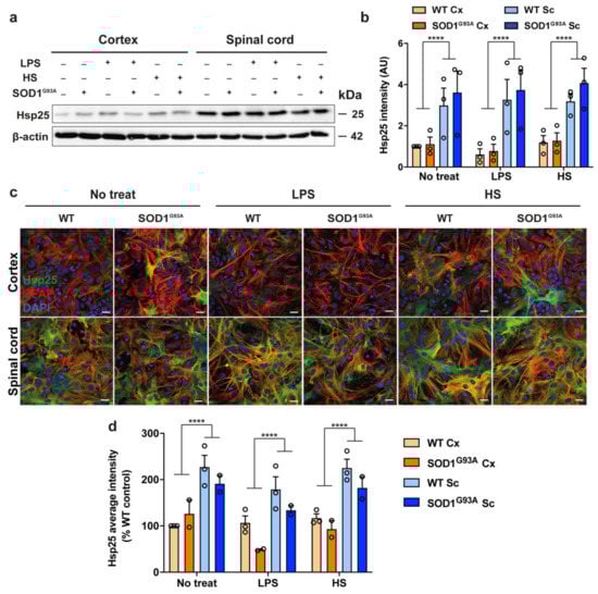 Hsp25 expression in SOD1 G93A mixed glial cultures derived from the cortex and spinal cord. Mixed primary cortical and spinal cord glia were either treated with LPS (80 µg/mL) or heat shocked (42 °C/30 min followed by recovery at 37 °C/24 h). Cells were then harvested for immunoblotting or fixed, permeabilised and immunolabelled for GFAP and Hsp25 and analysed by fluorescence microscopy. (a,b) Immunoblotting, quantification and fold change of Hsp25 (25 kDa) levels in whole-cell lysates relative to β-actin in cortical and spinal cord samples. (c) Immunofluorescence of mixed glial cultures immunolabelled for Hsp25 and GFAP and counterstained with DAPI. Scale bar = 20 µm. (d) The average intensity of Hsp25-AF488 staining normalised to WT cortical control in cortical and spinal cord samples. Data shown are the means ± SEM of 2–3 independent experiments. Statistically significant differences between the means were assessed using a two-way ANOVA followed by Bonferroni’s post hoc test, where p < 0.0001 (****).