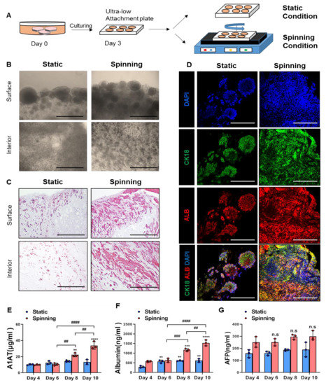 Mechanical stimuli that are absent in static culture conditions contribute to the formation of key physiological structures and affect the growth and functionality of cells encapsulated in bioprinted structures [13]. Based on these facts, we adjusted the bioreactor-like system to recapitulate a microfluidic environment containing a mechanical stimulus mimicking blood flow and diffusion by circular shaking motion using an orbital shaker. HepG2 cells were encapsulated in bioprinted hepatic constructs and cultured under either static or spinning conditions where continuous media flow was induced using a platform orbital shaker at 60 rpm (Figure 2A). On day 14, bright-field images exhibited large spheroids, which were observed on the edge of bioprinted hepatic constructs, and spinning conditions contributed to the formation of larger amounts of spheroids (Figure 2B). In addition, cells located in the interior area of the bioprinted hepatic construct under spinning conditions showed more obvious aggregation and proliferation than those under static conditions (Figure 2B). Representative H&E images showed not only a large number of encapsulated cells but also spreading out of the whole bioprinted hepatic construct under spinning conditions compared to static conditions (Figure 2C). Next, we examined whether HepG2 cells in bioprinted hepatic constructs under spinning conditions could maintain hepatic expression and functionality for 14 days. The hepatic expression of HepG2 cells within bioprinted hepatic constructs was visualized with cytokeratin 18 and albumin antibodies. Compared to static conditions, spinning conditions contribute to the formation of larger amounts of CK18+ ALB+ cells in bioprinted hepatic constructs (Figure 2D). This result indicated that although bioprinting was performed using equal cell concentrations, the amounts of the cells remaining in the bioprinted hepatic constructs could differ depending on the culture conditions. Consistent with many observed morphological changes, there are also functional reinforcements in hepatic constructs cultured under 3D spinning conditions. In contrast to the increased secretion of human albumin (ALB) and alpha-1-antitrypsin (A1AT), the secreted level of alpha-fetoprotein (AFP) in the culture supernatant of bioprinted hepatic constructs did not show significant differences between static and spinning conditions from day 4 to day 10 (Figure 2E–G). These results are also consistent with the impact of spinning conditions in terms of the growth and maturity of encapsulated cells. Therefore, our results imply that spinning conditions enable HepG2 cells to grow with a consistent hepatic phenotype in bioprinted hepatic constructs over 2 weeks after bioprinting. Additionally, further studies on the secreted level of immature AFP protein compared to other proteins need to be conducted to more accurately explore the effects of spinning conditions on functional maturity utilized by different sources of human hepatocytes. Taken together, reinforcement of the clonogenic growth potential of encapsulated cells and functional maturation can be enhanced under spinning conditions. Additionally, the application of the orbital shaker provides continuous stimuli with appropriate diffusion of oxygen, nutrients and mechanical stimulation that supports defined and well-distributed encapsulated cells.