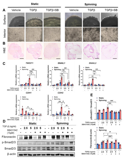 Spinning condition compared to static condition enhances TGF-β-induced epithelial-to-mesenchymal transition (EMT) pathway upregulation and inhibition by SB431542 treatment in bioprinted hepatic constructs. (A) Morphology of the surface and interior areas of bioprinted hepatic constructs in each group on day 10. Subgroups were divided into nontreated vehicle control, TGFβ-treated and combination of TGFβ with SB431542. Scale bar = 1000 μm. (B) Representative view of growth based on images for H&E staining of bioprinted hepatic constructs treated with TGF-β or TGF-β and SB431542 together under spinning and static conditions on day 10. Scale bar = 1000 μm. (C) qRT-PCR analysis of TWIST1, SNAIL1, SNAIL2, CDH1 and CDH2 genes that are involved in the EMT pathway in bioprinted hepatic constructs under static and spinning conditions on day 10. Error bars represent the means ± S.D. from three separate experiments. One-way ANOVA followed by Bonferroni’s test was used for statistical analysis. * p < 0.05, ** p < 0.01, *** p < 0.001 and **** p < 0.0001 show significance between control and other group under indicated culture condition. # p < 0.05, ## p < 0.01, ### p < 0.001 and #### p < 0.0001 denote significance among each group under indicated culture condition. (D) Western blot analyses of total cell lysates from bioprinted hepatic constructs using anti-fibronectin, anti-phosphosmad2/3, anti-Smad2/3 and anti-β-actin antibodies. β-Actin served as a loading control. (E) Quantification of fibronectin expression normalized to β-actin and phoshpho-Smad2/3 expression normalized to Smad2/3. One-way ANOVA followed by Bonferroni’s test was used for statistical analysis. Error bars represent the means ± S.D. from three separate experiments. ** p < 0.01, *** p < 0.001 and **** p < 0.0001 indicate significance between control and other group under indicated culture condition. # p < 0.05, ## p < 0.01 and #### p < 0.0001 show significance among each group under indicated culture condition.