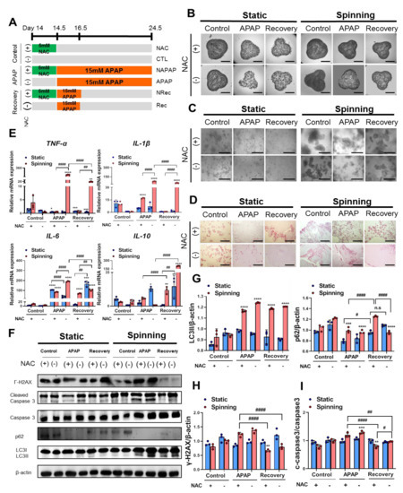 Because we observed that reinforcement of TGFβ induced the EMT process under spinning conditions, we hypothesized that drug responses in bioprinted hepatic constructs could also be improved depending on culture conditions. To ensure that the drug effect was in accordance with culture conditions, two drugs were selected: acetaminophen (APAP) for the induction of hepatotoxicity and N-acetylcysteine (NAC) for the prevention of APAP-induced hepatotoxicity. The confluency of encapsulated cells and the number of spheroids in the bioprinted hepatic constructs affect drug metabolism [19]. Hence, we introduced spinning conditions for 14 days to generate a large number of spheroids and provided similar confluency of encapsulated cells in all the bioprinted hepatic constructs. Extended treatment with NAC hinders hepatic function and impairs recovery potential from APAP-induced hepatotoxicity [30]. Thus, we treated bioprinted hepatic constructs with NAC 12 h before APAP treatment at the indicated time point (Figure 4A). Under spinning conditions, the control groups showed that a larger number of larger spheroids remained inside the bioprinted hepatic constructs (Figure 4B). However, following APAP treatment for 2 days, we observed reduced confluency of small spheroids in whole bioprinted control groups regardless of culture conditions. After APAP treatment, we divided the group into continuous APAP treatment (NAPAP) and no APAP treatment (Figure 4C). However, significant morphological changes under static conditions compared with NRec and Rec as well as NAPAP and APAP resulting from administration of NAC were not observed (Figure 4B). Representative H&E images show damaged cell nuclei in the APAP group, especially under spinning conditions. APAP overdose induces severe liver injury accompanied by reactive metabolite formation, mitochondrial damage, cell death via apoptosis and autophagy signaling [31,32]. To assess the effect of APAP and NAC treatment depending on culture conditions, Western blot analysis was performed (Figure 4D). As expected, RT-PCR and Western blot analysis of bioprinted hepatic constructs subjected to drug treatment under spinning conditions showed higher levels of the proinflammatory cytokines TNF-α, IL-1β and IL-6 in the APAP and Rec groups compared with the static group [31,33]. On the other hand, IL-10 expression was enhanced in Rec under spinning conditions (Figure 4E). In addition, bioprinted hepatic constructs showed increased apoptosis levels, as observed by the expression of cleaved caspase-3 with constant APAP treatment (Figure 4F,I). Additionally, increased autophagy levels were identified based on a reduction in p62 and an increase in LC3II in the APAP group under spinning conditions (Figure 4F,G). In contrast to static culture conditions, apoptosis and autophagy effects were reinforced in NAPAP compared to APAP. In particular, the effect of NAC administration was significant in the NRec and Rec groups. Consistent with the activation of autophagy and apoptosis pathways with persistent APAP treatment, bioprinted hepatic constructs under spinning conditions showed enhanced levels of gamma H2AX, a hallmark of DNA double-strand breaks (Figure 4F,H). Furthermore, administration of NAC to bioprinted hepatic constructs prevented APAP-induced hepatotoxicity via apoptosis and autophagy signaling. In particular, the NRec and Rec groups exhibited regenerating liver phenomena confirmed by dephosphorylated H2AX expression from acetaminophen-induced hepatotoxicity [34]. Based on these results, spinning conditions contribute to efficient drug sensitivity ranging from APAP-induced hepatotoxicity to prevention of hepatotoxicity by administration of NAC compared to static conditions.