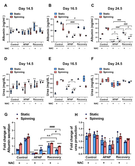 To examine whether spinning conditions improve the functionality of bioprinted hepatic constructs for drug sensitivity, functional evaluation of bioprinted hepatic constructs was performed by assessing the level of albumin secretion and urea synthesis. The liver synthesizes albumin, which plays a role in carrying hormones, vitamins and enzymes to maintain homeostasis in the body and is secreted into the blood. Additionally, the liver is the primary site for the urea cycle, which converts highly toxic ammonia to urea for excretion. Therefore, the levels of albumin secretion and urea synthesis in blood or culture supernatant represent liver functionality. Specifically, low levels of albumin and urea indicate liver dysfunction. Under spinning conditions, control groups showed not only increased levels of secreted albumin but also increased urea production in culture supernatants compared to the static group. Additionally, APAP treatment in bioprinted hepatic constructs significantly decreased the level of secreted albumin and urea production (Figure 5A–F). Due to inaccuracies during extrusion-based bioprinting, unequal amounts of cells could lead to a misunderstanding of drug effects following different culture conditions. Thus, the fold change in albumin secretion in all groups was examined on day 10 and normalized to the secreted level in the culture supernatant after NAC treatment (Figure 5G,H). Both the fold change of urea production and albumin secretion indicated a more accurate drug effect under spinning conditions because no significant differences were observed in all groups on day 0.5. On day 16.5, the APAP and Rec groups were at a similar stage of acetaminophen-induced hepatotoxicity; however, bioprinted hepatic constructs cultivated under static conditions showed inconsistent changes in the level of albumin secretion and urea synthesis (Figure 5B,E). Taken together, these results suggest that spinning conditions increased the susceptibility of drugs in bioprinted hepatic constructs immediately and clearly.