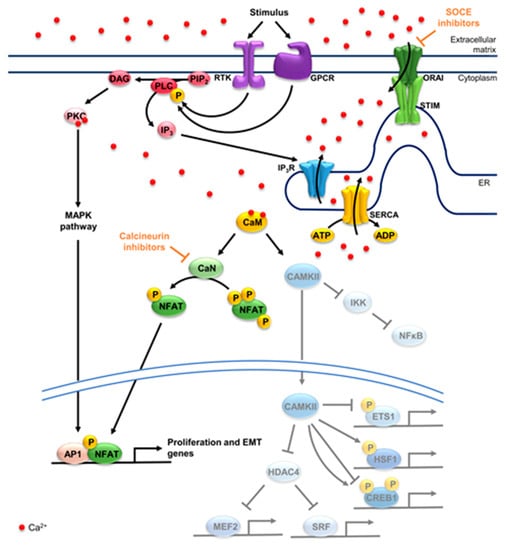 Increased cytoplasmic calcium levels lead to the activation of calmodulin-dependent proteins such as kinases and phosphatases. These, in turn, promote the activation or inactivation of several other transcription factors [,] (Figure 1). One of these important kinases is calcium/calmodulin-dependent protein kinase II (CAMKII) which translocates to the nucleus and phosphorylates calcium/calmodulin-dependent protein kinase IV (CAMKIV) upon activation. CAMKII and CAMKIV further phosphorylate and activate several transcription factors in the cytoplasm and the nucleus []. In the cytoplasm, CAMKII releases the inflammation-associated transcription factor nuclear factor-kappa B (NFκB) from an inhibitory complex by activating inhibitor of nuclear-factor kappa B kinase subunit beta (IKK2) [,,]. Once in the nucleus, cAMP response element-binding protein (CREB) is activated upon phosphorylation of Ser133 by CAMKIV, while CAMKII can phosphorylate Ser133 or Ser142 of CREB, thereby activating or inhibiting it, respectively [,]. CREB hyperactivation has been tightly associated with cancer initiation, development and metastasis [,]. Another common target of CAMKII and CAMKIV is the serum response factor (SRF), which is activated upon phosphorylation by both enzymes [,], and is best characterized for driving key cell migration genes [,]. CAMKII activity is also linked to the cellular stress response, as it phosphorylates and activates the stress responsive transcription factor heat shock factor 1 (HSF1) at Ser230 [,]. HSF1 has been shown to not only enable tumor cells to thrive under stress, but to also foster cell proliferation, invasion and migration, while dampening inflammation and apoptotic programs [,]. Protein c-ets-1 (ETS1) is also inhibited upon phosphorylation by CAMKII [,]. ETS1 is best known for fostering cell invasion and playing an important role in angiogenesis, while also promoting epithelial-to-mesenchymal transition (EMT) in several cancers including PDAC []. Interestingly, CAMKII and CAMKIV can also phosphorylate histone deacetylase 4 (HDAC4) promoting its nuclear export. HDAC4 not only deacetylates histones but can also inhibit SRF and myocyte enhancer factor 2 (MEF2). This way, CAMKII and CAMKIV indirectly activate SRF, while also promoting the activity of MEF2, whose oncogenic or tumor suppressive roles remain to be further investigated [,].