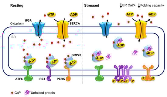GRP78 is the main sensor of unfolded proteins and direct regulator of ER stress mediators, linking the cellular energy and ER calcium levels to ER stress. Under resting conditions, GRP78 inhibits ER stress mediators by directly interacting with their luminal domains, which in turn hinder the ATPase activity of GRP78. GRP78 binds unfolded proteins and hydrolyzes ATP to ADP upon stress, trapping the unfolded protein and dissociating from ER stress mediators triggering ER stress. Only after successful folding of the protein and exchanging ADP for ATP is GRP78 able to inhibit ER stress mediators again [,]. Thus, GRP78 is the main activator of the stress response, being the major sensor of accumulated unfolded proteins in the ER, and whose activity is directly modulated by cellular ATP as well as ER calcium levels (Figure 2).