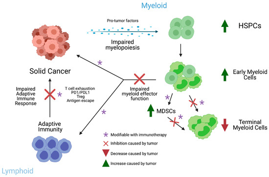Schematic of interaction between myelopoiesis and cancer immunity. Image created using biorender.com (accessed on 25 March 2021).
