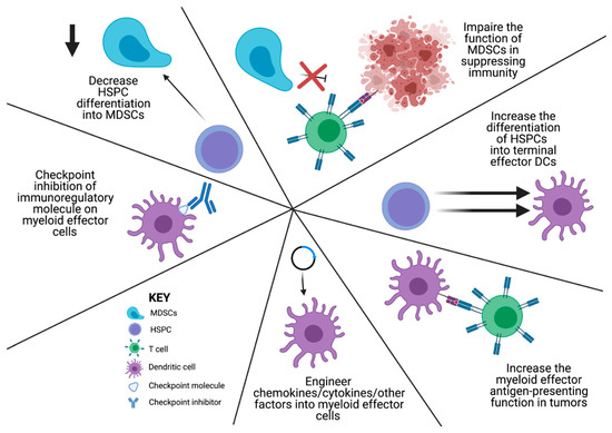 Given the significant immunomodulatory potential of early myeloid cells, the following discussion will cover some of the current strategies using HSPC transfers to overcome tumor-mediated derangements in myelopoiesis. However, there are a number of important targetable aspects of the mechanisms outlined above that deserve attention. Given the papers outlined above, the steps at which a potential immunotherapeutic intervention could be possible includes the following: 1. decreasing HSPC differentiation into MDSCs; 2. impairing the function of MDSCs in suppressing immunity; 3. increasing the differentiation of HSPCs and MDSCs into terminal effector DCs; 4. increasing the myeloid effector antigen-presenting function in tumors; 5. checkpoint inhibition of immunoregulatory molecule expression on myeloid effector cells; and 6. engineering chemokines/cytokines/other factors into myeloid effector cells (Figure 3). Specific targeted therapies that have been promising include the modulation of immunosuppressive myeloid cell generation in the TME [73]. Most of these mechanisms of action are focused on flipping the switch from an immunosuppressive to an immune-activating TME, or an M2 to an M1 phenotype [12,13,74]. One of the most promising is the development of CSF1R antagonists. These therapies are targeted against the primary mechanism of MDSC and TAM recruitment, activation, and immunosuppressive function that occurs through CSF1R signaling [74,75,76,77,78,79,80,81,82]. While considerable work has been performed, an optimal combinatorial platform for clinical success has not yet been developed [76]. The following discussion will provide an overview of strategies using HSPC transfers as immune-modulating therapies.