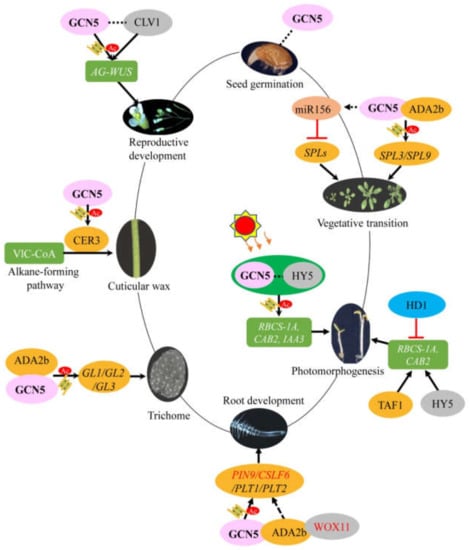 In summary, GCN5 plays important roles in the development of Arabidopsis from juvenile to adult processes, and from vegetative growth to reproductive growth with multifarious downstream factors (Figure 1). As an epigenetic factor, GCN5 is involved in the regulation of plant organs development through participating in H3K9/K14 acetylation process on various downstream genes or promoters. The deletion and destruction of GCN5 and ADA2b genes in Arabidopsis severely affect the development and growth of stems, roots, and leaves [,], which proposes the implicit and core roles of GCN5 and ADA2b in the SAGA complex associated with plant development. More interestingly, GCN5 also regulates stem cell development and cell pluripotency by the WUS-AG pathway, which reinforces the importance of epigenetic modifications in eukaryote development and cell regeneration and provides new ideas and clues for the utilization of histone acetyltransferase such as GCN5 to improve the production of beneficial plant organs and favorite traits of crops. However, whether GCN5 plays some roles in seed-related traits (e.g., seed dormancy establishment, seed maturation, seed germination) has not been reported.