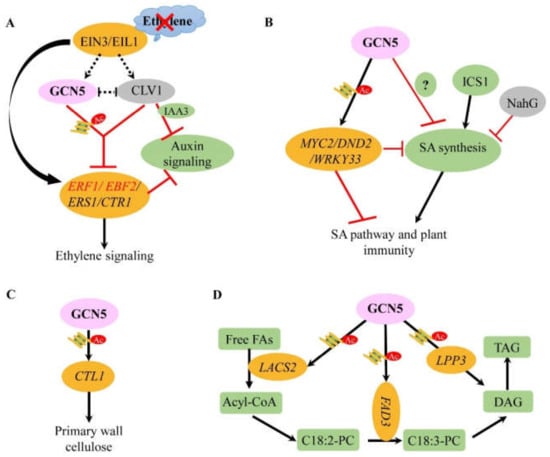The mechanisms of GCN5 in plant hormone biosynthesis and secondary metabolic pathways. (A) When ethylene is absent, GCN5 and CLV1 are involved in ethylene signaling through regulating some key genes transcription (e.g., ERS1, ERF1, EBF2, CTR1) by histone acetylation, which is dependent on the EIN3 factor; meanwhile, GCN5 and CLV1 also mediate IAA3 and auxin signaling synergistically, proposing the crosslink between ethylene and auxin. But GCN5 and CLV1 show antagonistic actions on the histone acetylation of H3K9/14, which results in the up-regulation of ERS1, ERF1, EBF2, CTR1 in the clv1-1 gcn5-1 double mutant. Moreover, EIN3 can directly bind the promoters of ERF1 and EBF2 to control their transcription too (black curved arrow). (B) GCN5 regulates downstream targets MYC2, DND2, and WRKY33 expression through histone acetylation, which inhibits the SA synthesis and accumulation; on the other hand, GCN5 mediates SA synthesis through an unidentified pathway independent of NahG and ICS1 to participate in SA-mediated plant immunity. (C) GCN5 can mediate the histone acetylation level of GTL1 to affect its transcription and the associated cellulose synthesis. (D) In fatty acid synthesis, GCN5 can directly regulate histone acetylation of FAD3 and others (e.g., LACS2, LPP3) to mediate their transcription expression, and involve the different steps of fatty acid synthesis and accumulation. DAG, diacyl glycerol; TAG, triglyceride. GCN5 is indicated in the pink oval. The black arrows indicate active regulation, and the red bars indicate inhibition. The straight line represents the direct action, and the dashed line represents the indirect action. The histone acetylation modifications are represented with a graphic histone binding with the acetyl group (a red circle).
