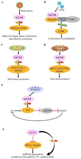 Phosphorus is an essential macronutrient in plant metabolism and plays several important roles in plant growth and development such as energy metabolism, synthesis of nucleic acid, cell membrane formation, photosynthesis, and respiration. Phosphorus deficiency is a factor limiting plant growth and productivity in 40% of the world’s arable soils []. Therefore, plants have evolved regulatory mechanisms to maintain phosphorus homeostasis by improving phosphorus uptake, transport, recycling, and utilization efficiency [,,]. By transcriptome analysis, 888 genes potentially involved in phosphate starvation response were identified to be regulated by GCN5. ChIP assay indicated that a long non-coding RNA (lncRNA) AT4 is a direct target of GCN5, and GCN5-mediating acetylation of H3K9/K14 determines the dynamic expression of AT4. In the absence of phosphorus, Arabidopsis gcn5 mutants display attenuated phosphate accumulation between roots and shoots, while the constitutive expression of AT4 in gcn5 mutants can partially restore phosphate redistribution. Further studies evidenced that miR399 and its target PHOSPHATE 2 (PHO2) mRNA level are influenced in the regulation of AT4 by GCN5 []. In summary, GCN5-mediating histone acetylation plays an important role in the regulation of phosphate starvation response through the AT4-miR399-PHO2 pathway (Figure 3E), which provides a new epigenetic mechanism representing the interaction between histone acetylation and non-coding RNA and shows the significant function of GCN5 in plant phosphorus metabolism. To sum up, GCN5 plays multiple and important roles in plants’ resistance to diverse abiotic stresses including not only cold and heat stress, but also iron stresses and others through different downstream pathways and interacting factors.