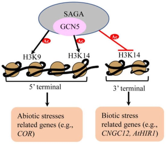 The molecular mechanisms of GCN5 involved in abiotic and biotic stresses on the genomic level. On the genomic level, the SAGA complex associated with GCN5 exerts dual and opposite effects on H3K14Ac level at the 5′ and 3′ ends of target genes as well as a positive role on H3K9Ac. Generally, the positive (e.g., COR) and negative (e.g., CNGC12, AtHIR1, and WRKY57) regulated genes are correlated with abiotic and biotic stress responses, respectively.