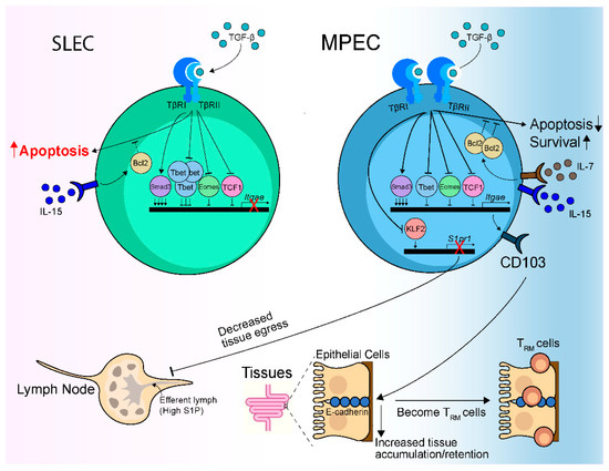 TGF-β regulates the development and maintenance of CD103+ CD8 TRM cells through multiple mechanisms. (1) By skewing towards an MPEC phenotype—MPEC, but not SLEC, can form CD103+ CD8 TRM cells. The survival of SLEC depends on IL-15, which cannot overcome TGF-β-mediated apoptosis. MPEC can respond to both IL-15 and IL-7, and IL-7 is able overcome the apoptotic effect induced by TGF-β. As a result, TGF-β selectively promotes the apoptosis of SLEC, leading to the accumulation of MPEC that favors the development of CD103+ CD8 TRM cells. (2) Through regulating CD103 expression—TGF-β can directly induce CD103 expression through Smad3 or indirectly promote CD103 expression by counteracting T-bet, Eomes, and TCF1-mediated suppression of CD103 expression, thus supporting CD103+ CD8 TRM cell development and maintenance through CD103-mediated tissue accumulation and retention. Although both SLEC and MPEC can respond to TGF-β, SLEC do not appear to express CD103 likely due to their lower TGF-βRII expression and the enhanced suppression of Itgae (the gene encoding CD103) expression by their heightened T-bet expression. (3) Through regulating KLF2 expression—TGF-β can downregulate KLF2 expression, which in turn downregulates S1PR1 expression and prevents S1PR1-mediated tissue egress of CD8 T cells, thus promoting the development of CD8 TRM cells in the tissue.