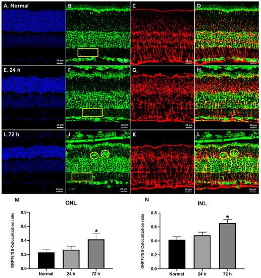 We subsequently examined the GRP78 expression in RD retinas at 24 h and 72 h after blue LED exposure (Figure 2) when photoreceptor degeneration started and peaked, respectively [22,23,24]. GRP78 immunoreactivity was increased in the ONL and IPL after LED exposure in a time-dependent manner (yellow rectangles in Figure 2B,F,J). In the RD retina 72 h after blue LED exposure, many GRP78-labeled lumps were observed in the ONL (yellow circles in Figure 2J). Considering that GRP78 is mainly localized in a cellular component of the intercellular spaces between photoreceptors in the normal retina (Figure 1B), which might be Müller cell processes, its cellular identity appeared to be Müller cells not photoreceptors. To confirm this point, we performed a double-label immunofluorescence experiment with anti-GRP78 and anti-GS, a representative Müller cell marker. In the normal retina, GS immunoreactivity was found in Müller cells whose bodies were situated in the middle of the INL and processes in the ONL, OPL, IPL and GCL from cell bodies to the outer and inner limiting membranes with a variety of lines in size (Figure 2C). In the RD retinas, GS immunoreactivity was remarkably increased in the ONL and thus it appeared as circles and outwardly extending thick irregular lines (Figure 2G,K,M), which suggested that Müller cell processes became hypertrophied and occupied the ONL where photoreceptors degenerated. In merged images (Figure 2D,H,L), the co-localization of GRP78 with GS in the ONL and INL was observed in approximately 23% and 41% of the normal retina, respectively, and significantly increased to 42% and 66%, respectively, in RD at 72 h after blue LED exposure (p < 0.05, n = 7 in Figure 2M,N).