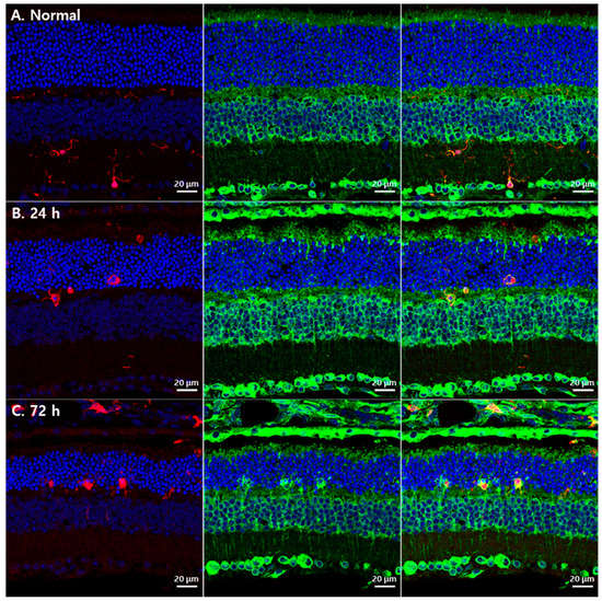 However, GRP78-labeled lumps in the ONL in RD at 72 h after blue LED exposure did not show GS immunoreactivity (Figure 2L, yellow circles) suggesting that they belonged to different cellular profiles. As microglial cells occurred in similar locations in this RD model with the same morphology [22,23,24], we tested whether GRP78 was expressed in microglial cells in RD retinas by double-labeling with anti-GRP78 and anti-IBA1, a microglial cell marker. In the normal retina, IBA1-labeled microglial cells were mainly observed in the IPL and OPL (red in Figure 3A). However, in RD induced by blue LED exposure, IBA1-labeled microglial cells were mainly found in the ONL and inner and outer segment layers of the photoreceptors (red in Figure 3B,C). These microglial cells showed weak GRP78 immunoreactivity in their cell bodies and processes in normal retinas (Figure 3A) while it was increased in activated microglial cells, which migrated into the ONL where photoreceptors degenerated followed by the time course of RD (Figure 3B–C). In addition, GRP78-labeled lumps in the ONL observed in RD at 72 h after blue LED exposure were co-labeled with IBA1 (Figure 3C). These results indicated that resting and activated microglial cells expressed GRP78 in the normal and RD retinas and GRP78 expression was increased as microglial cells were activated in RD.