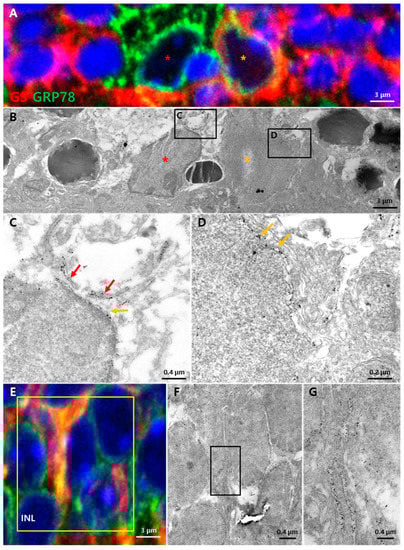 Finally, we want to refer to GRP78 at the mitochondria and mitochondria-associated ER membrane. Recently, growing evidence has pointed towards GRP78 playing an important function in the mitochondria in association with co-chaperones known to be involved in calcium-mediated signaling between the ER and mitochondria, important for bioenergetics and cell survival [55]. As previous reports detected GRP78 in the mitochondria [56,57] and mitochondria-associated ER membrane [58], we tried to detect mitochondrial GRP78 localization in photoreceptors and glial cells by EM. However, immuno-gold-labeled GRP78 was rarely detected in the mitochondria either in photoreceptors or glial cells. There was also no distinguishable ER region of a strong GRP78 expression close to the mitochondria (data not shown). Nevertheless, this issue needs to be further investigated in the near future.