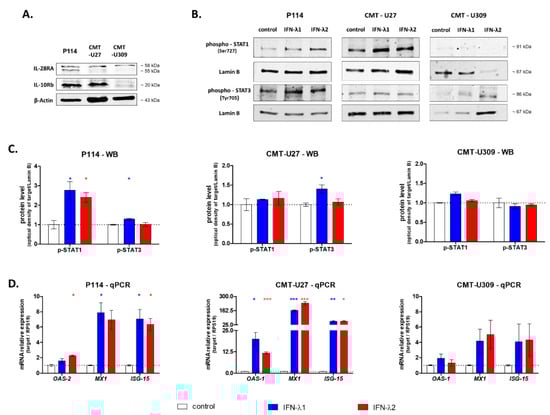 First, to assess the IFN-λ receptor presence in all three cell lines used in this study, we performed Western blot analysis. We showed the expression of the IL-28RA subunit in all three cell lines; however, CMT-U27 cells do not express the second subunit of the receptor—IL-10Rb (Figure 1A).