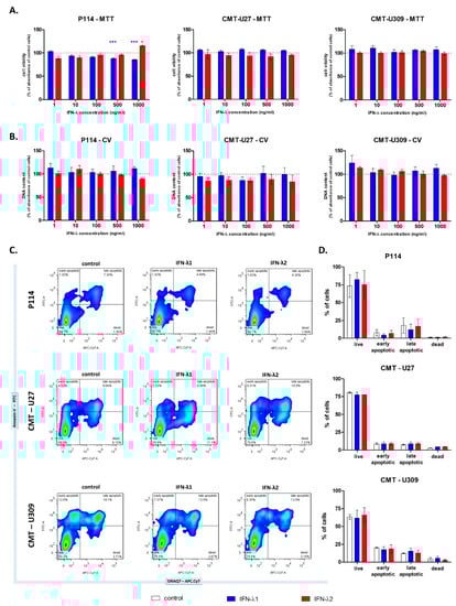 The MTT assay did not show an effect of IFN-λ1 or IFN-λ2 on CMT cell respiration, except for the P114 cells treated with the highest cytokine concentrations. The metabolic activity of these cells decreased to approximately 90% and 85% after 24 h incubation with IFN-λ1 in 500 and 100 ng/mL, respectively. However, treatment with IFN-λ2 at 1000 ng/mL increased P114 cell respiration by 15% (Figure 2A). The CV assay revealed that IFN-λ does not affect the level of cellular DNA of CMT cells (Figure 2B). Moreover, the assessment of programmed cell death did not show any differences between IFN-λ-treated cells and cells cultured in control medium (Figure 2C,D).