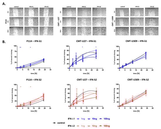Pictures of the wound-healing processes of CMT cells under IFN-λ1 or IFN-λ2 treatment at the concentration of 100 ng/mL at the selected time points after scratching (A) The graphs showing the wound healing speed in time after scratching in cells cultured in control conditions or treated with IFN-λ1 or IFN-λ2 (B). The results are presented as the mean ± SEM. A one-way ANOVA and Dunnet’s HSD post hoc test were applied. The statistical differences found between control cells and cells treated with IFN-λ at 100 ng/mL concentration are presented by asterisks. Significance levels are indicated as follows: * p < 0.05; ** p < 0.01.