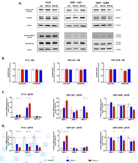 Representative images of Western blot showing the expression of phospho-Akt and Akt, phospho-ERK1/2 and total ERK1/2 and β-actin (loading control) in whole CMT cell lysates (A). The graphs showing the relative phosphorylation of Akt and ERK1/2 in CMT cells (B). The graphs showing the relative mRNA of extracellular matrix metalloproteinase expression in CMT cells treated with IFN-λ1 and IFN-λ2 for 24 h (C). The graphs showing the relative mRNA of extracellular matrix metalloproteinases inhibitor expression in CMT cells treated with IFN- λ1 and IFN-λ2 for 24 h (D). The results are presented as the mean ±SEM. A one-way ANOVA and Dunnet’s HSD post hoc test were applied. Significance levels are indicated as follows: * p < 0.05; ** p < 0.01; *** p < 0.001.
