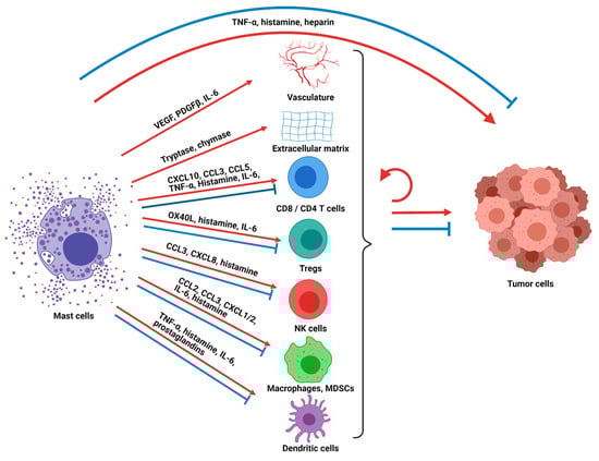 Tumor-associated mast cells have been observed in the solid tumor microenvironment of numerous cancers and have intriguingly been found to be a favorable prognostic factor in some cancers, such as esophageal adenocarcinoma, ovarian cancer, and diffuse large B-cell lymphoma [,,], while they are associated with a poor or mixed prognosis in other cancers, such as gastric cancer, lung cancer, melanoma, and breast cancer [,,,,,]. There is also growing awareness that mast cells are a biomarker and important determinant of cancer treatment responses. We recently demonstrated that higher pre-treatment mast cell infiltration is significantly associated with poor responses to pre-surgical chemotherapy in an aggressive form of localized breast cancer [], and recent data show that higher mast cell tumor infiltration predicts poor responses to anti-PD-1 ICB in melanoma []. Mast cells can accumulate in cancers due to various growth factors and chemokines, including stem cell factor (SCF), vascular endothelial growth factor (VEGF), CCL2, IL-8, complements, and PGE2 [,]. Due to the multifaceted nature of mast cells and their immunomodulatory effects upon activation or degranulation, mast cells have been found to be both pro- and anti-tumorigenic (Figure 1). As discussed above, there is substantial variation in mast cell phenotype and function and the extent to which they produce and release mediators based on anatomic location, stage of mast cell development, and exposure to environmental inflammatory mediators. Additionally, the downstream effects of secreted mediators are also heterogeneous based on the specific constitution of the surrounding environment and target cells. Therefore, the ability of mast cells to promote or impede tumorigenesis has been shown to be dependent on tumor type, cancer stage, the activation status of the mast cells, the location of the mast cells within the tumor microenvironment, and the net balance of pro- and anti-tumorigenic effects on the tumor cells []. For example, in a study of surgically resected non-small cell lung cancer patients, intratumoral mast cells but not stromal mast cells were associated with a favorable prognosis [,]. Similarly, analysis of prostate cancer samples shows that a higher number of mast cells in the tumor compartment had longer cancer-specific survival, whereas the inverse was seen with mast cell infiltration in the non-malignant stromal compartment [].