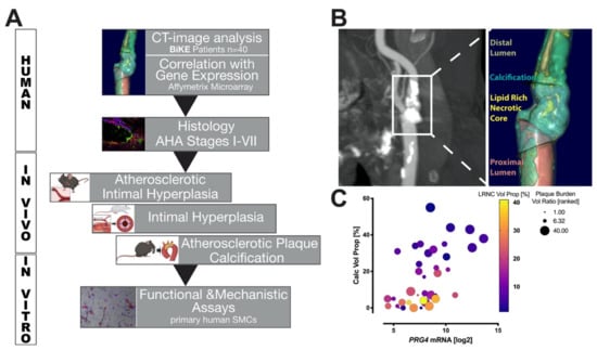 A cohort of patients with end-stage, high- and low- calcified carotid plaques (n = 40), as previously described [4], was used to correlate PRG4 mRNA expression from plaque microarrays with quantitative morphological tissue composition as assessed by image analysis of pre-operative CTA (Figure 1A). We proceeded to confirm PRG4 protein expression and investigate its localization within end-stage human carotid plaques, as well as its relation to disease progression in pathological samples of aortic atherosclerotic lesions representing AHA-stages I–VII. To assess the role of PRG4 during early plaque development, we used two ApoE−/− mouse models representing atherosclerotic plaque calcification and intimal hyperplasia, as well as a longitudinal rat balloon-injury carotid artery intimal hyperplasia model. Mechanisms of PRG4 induction in the context of SMC activation and osteogenic modulation were investigated using human primary SMC cultures.