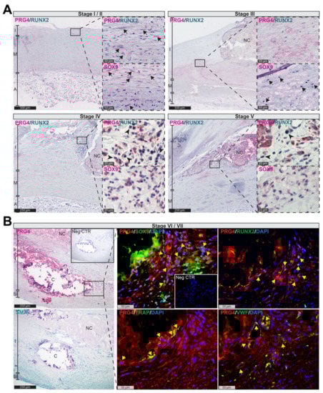 The following primary antibodies were used in the study: PRG4 (HPA028523, Sigma-Aldrich, St. Louis, MO, USA), SMA (M0851, DAKO, Santa Clara, CA, USA), CD68 (M0876, DAKO, Santa Clara, CA, USA), TRAP (LS-C87845, LS BIO, Seattle, WA, USA), SOX9 (AMAB90795, Sigma-Aldrich, St. Louis, MO, USA; Ab26414, Abcam, Cambridge, UK), RUNX2 (AMAB90591, Sigma-Aldrich, St. Louis, MO, USA), VWF (M0616, DAKO, Santa Clara, CA, USA).