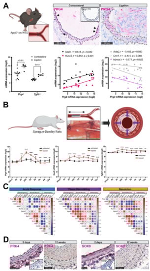 PRG4 is implicated during early intimal vascular remodeling in vivo. (A) IHC detected a sporadic presence of PRG4 protein in carotid arteries of ApoE−/− mice. However, in partially ligated carotids, there was an increase of signal throughout the media (dashed lines) and neo-intima. Hematoxylin was used as counterstain. Prg4 and Tgfb1 mRNA expression was significantly increased after ligation compared to contralateral controls. Sox9 and Runx2 mRNA levels were positively correlated with Prg4 expression, while typical markers for SMC quiescence showed a negative correlation (grey color indicating correlations not reaching statistical significance). (B) In rat carotid balloon injury, Prg4 mRNA was significantly elevated together with Sox9 expression. Its levels peaked at 20 h and gradually normalized thereafter. This model also showed an upregulation of Tgfb1 at two hours and throughout the healing process. (C) Correlograms of Prg4 with expression of major markers (positive correlation—red, negative correlation—blue, circle size—Pearson coefficient) indicate: strong positive correlation of Prg4 with osteogenic genes (i.e., Sox9, Bmp2), and inflammatory markers (i.e., Cd80, Cd68), but negative correlation with sensitive markers of contractile SMCs (Myh11, Smtn, Tagln) during early acute response to injury (0–2 h). During the tissue remodeling phase (20 h–5 d), decreasing Prg4 expression positively correlated with Bmp2, as well as typical contractile and inflammatory markers. However, it negatively correlated with the osteogenic transcription factor Runx2. Concomitantly with the resolution of injury response (2–12 weeks), Prg4 expression levels were downregulated and showed positive trends in association with recovery of typical SMC markers. (D) Immunohistochemistry showed that the presence of PRG4 protein preceded intimal remodeling already at two days post injury, but persisted within the ECM even after 12 weeks. The SOX9 signal was strong within the luminal medial layer after injury and not any more detectable on protein level 12 weeks after injury. Images show 40× magnification. Insets show corresponding isotype negative control. h—hours, d—days, w—weeks. Intact arteries used as controls. Plots show (A) mean with SEM or correlation, respectively; (B) mean with SD. Statistical difference between treatment-groups assessed by t-test; correlation assessed by (A) Spearman coefficient (n = 16 mice), (B) Pearson coefficient (n = 69 rats). ** p < 0.01, *** p < 0.001, **** p < 0.0001.