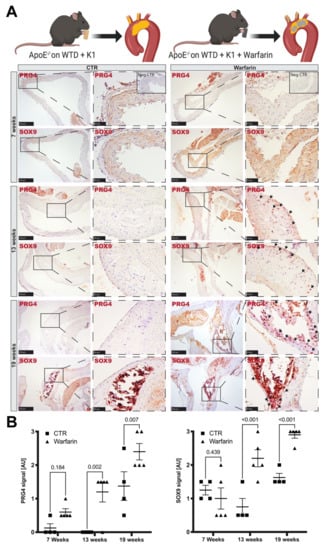End-stage human atherosclerotic plaques are characterized by intimal calcification and often contain macro-calcified nodules [23,25,47]. To investigate the role of PRG4 during atheroprogression and development of intimal macro-calcifications in vivo, we utilized a previously characterized model [29] where ApoE−/− mice, receiving a Western type diet supplemented with warfarin, develop severe calcifications in the aortic arch and brachiocephalic trunc. Histological analysis of these areas (Figure 4A) showed abundant PRG4 and SOX9 positive cells after 13 weeks. At 19 weeks, these cells were detected within and surrounding highly calcified regions. In some cases, PRG4 staining was preceded by widespread SOX9 signal throughout the whole vessel wall of warfarin treated animals already after seven weeks. Plaques of control animals showed a significantly lower signal for PRG4 and SOX9 during the later stages of plaque development, as assessed by semi-quantitative IHC scoring (Figure 4B).
