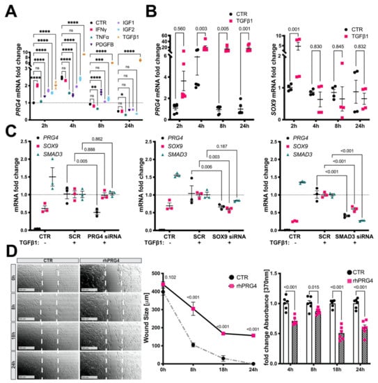 Endogenous PRG4 expression is induced by TGFβ1 and controlled by SMAD3 and SOX9, while extracellular PRG4 inhibits SMC migration and proliferation in vitro. (A) In HCtSMCs, stimulation by IFNγ, PDGFB, IGF1, IGF2 and TGFβ1 caused a significant early induction of PRG4 mRNA expression, while TNFα showed no effect. (B) This effect was replicated in HAoSMCs, concomitantly with an upregulation of SOX9 at 2h which rapidly returned to baseline thereafter. (C) While siRNA silencing of PRG4 in HAoSMCs upon TGFβ1 treatment affected neither SOX9 nor SMAD3 expression, PRG4 mRNA levels were downregulated by the knock-down of both SOX9 and SMAD3. SOX9 siRNA decreased only PRG4 levels, while SMAD3 siRNA decreased both SOX9 and PRG4, suggesting SMAD3 to be highest upstream regulator among these genes. (D) HAoSMCs treated with full length rhPRG4 exhibited significantly impaired migratory capacity in the scratch assay (left and middle panel) and decreased proliferation (right panel). CTR—untreated cells in identical medium and FBS conditions; SCR—scrambled control following TGFβ1; D—day; HCtSMCs-human carotid smooth muscle cells; HAoSMCs—human aortic smooth muscle cells; rhPRG4—recombinant human PRG4. Plots show mean with SEM. Statistical difference assessed by 2-way ANOVA; (A) n = 3, (B) n = 4, (C) n = 3, (D) n = 6 experimental replicates. ns p > 0.05, * p < 0.05, ** p < 0.01, *** p < 0.001, **** p < 0.0001.