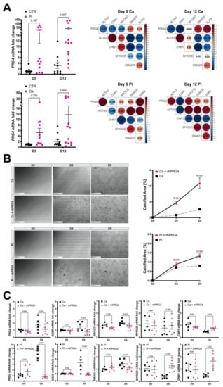 As PRG4 was associated with calcification and an osteogenic transition of SMCs, we next investigated the direct impact of pro-calcific conditions on PRG4 expression in SMCs. Stimulation of HAoSMCs with either 3.6 mM Ca or 2.6 mM PO4 induced ectopic calcification as assessed by fetuin-A staining (Figure S2A–C) and increased SOX9 and SMAD3 mRNA (Figure S2B–D). Expression of typical SMC contractility markers (ACTA2, CNN1) decreased, while MYOCD remained relatively stable and PRG4 expression was significantly upregulated, which positively correlated to SOX9 and SMAD3 expression. However, while the extent of calcification was higher with calcium exposure, stimulation with phosphate was able to induce higher expression levels of PRG4 mRNA after 12 days (Figure 6A). In addition, under calcium stimulation, PRG4 negatively correlated to ACTA2, CNN1 and MYOCD, whereas, under high phosphate, ACTA2 and MYOCD correlations turned positive. Of note, oxLDL loading (20 μg/mL) of HAoSMCs significantly induced PRG4, especially after 48 h when SOX9 levels were increased too, showing that elevated lipid levels also have an effect on PRG4 (Figure S3).