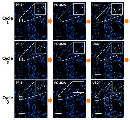 mRNA PPIB, POLR2A, and UBC in an FFPE mouse lung tissue are sequentially stained with tyramide-N3-Cy5 in three reiterative cycles. Scale bar, 50 μm.
