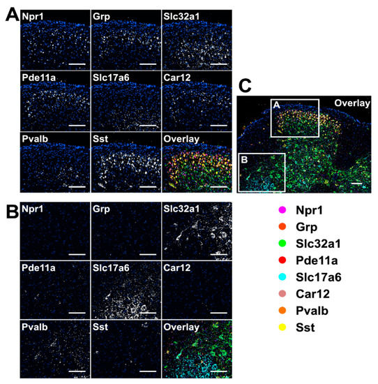 Eight different mRNA in a fixed frozen mouse spinal cord tissue are stained sequentially with tyramide-N3-Cy5. (A,B) are the different regions of the overlay image (C). Scale bar, 100 µm.