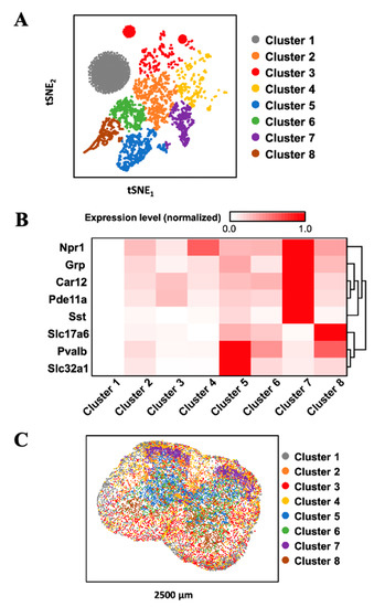 (A) Based on their mRNA expression patterns, the cells in a fixed frozen mouse spinal cord tissue are partitioned into 8 clusters. (B) The mRNA expression patterns in the different cell clusters. (C) Anatomical locations of the individual cells from the distinct clusters in the spinal cord tissue.