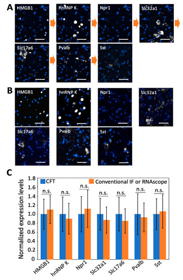 Integrated in situ analysis of RNA and proteins in the same specimen is of increasing importance in studies of gene expression regulation [29] and disease diagnosis [30]. Our laboratory recently developed cleavable fluorescent probes [27,31,32,33] for multiplexed protein imaging and demonstrated that these probes enable a large amount of different proteins to be accurately quantified in their native cellular contexts in single cells. To evaluate whether the multiplexed RNA and proteins in situ analysis can be combined in the same tissue using CFT, we stained two proteins and five mRNA sequentially using tyramide-N3-Cy5 in a mouse spinal cord tissue (Figure 7A). This tissue was first incubated with HRP-conjugated antibodies and tyramide-N3-Cy5 to stain the protein HMGB1. After fluorophore cleavage and HRP deactivation, the protein hnRNP K was stained using the same approach. Subsequently, HRP-conjugated oligonucleotides and tyramide-N3-Cy5 were applied to detect mRNA Npr1, Slc32a1, Slc17a6, Pvalb, and Sst in reiterative analysis cycles. We also performed the control experiments by staining the same seven targets in different tissues using conventional immunofluorescence and RNAscope approaches (Figure 7B). The staining patterns and expression levels obtained by our method and conventional approaches closely resemble each other (Figure 7C). These results suggest our approach allows the direct visualization and quantitative analysis of multiple RNA and proteins together in the same specimen.