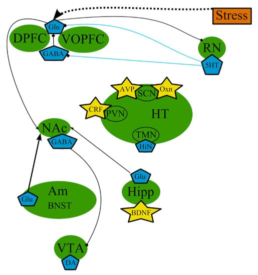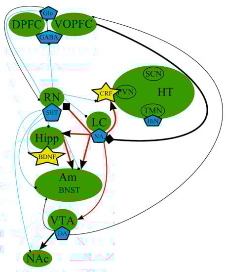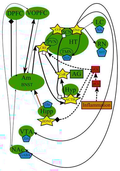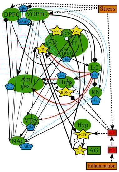 Over the past decades, it has become clear that the roles of stress and inflammation in the development of MDD are obvious. They can disrupt the chemical balance of a normal brain function (Figure 3, Figure 4 and Figure 6), as an influence of stress and inflammation in the form of proinflammatory cytokines and the subsequent chain of events and/or a destabilizing effect of stress on neurons in the PFC. Most individuals manage to recover to the normal state after the elimination of stress. However, if a damaging factor is persistent enough, the chemical balance of a brain shifts to a new self-sustaining state, which causes the manifestation of depressive symptoms []. For example, chronic stress leads to alterations in PFC and amygdala, shifting the balance of neurotransmitters in amygdala toward a depressive mood and inhibiting locus ceruleus and raphe nucleus. In addition, stress alters the levels of central cytokines, which, in turn, disrupt neurogenesis in hippocampus and initiate the pathological activation of the HPA axis. This axis may affect processes in suprachiasmatic nucleus and sleep/wake cycles. These processes are most likely supported and/or amplified with altered or impaired feedback loops from the affected areas (Figure 6). This new self-sustaining state of the brain in MDD includes the altered levels of NA and 5-HT in afferents from the LC and RN, respectively, and the changed levels of neurotransmitters in feedback afferents to the LC and RN []. Decreased 5-HT signaling from the RN leads to decreased 5-HT input to various brain areas such as nucleus accumbens, amygdala, hippocampus, and PFC. Research over the last 50 years has provided extensive evidence showing that abnormal monoamine neuronal function is an important underlying pathology in MDD []. Imaging studies indicated that MDD is associated with abnormal metabolism in limbic and paralimbic structures of the PFC []. This abnormal metabolism is normalized in the amygdala and PFC in patients showing a persistent antidepressant response [].