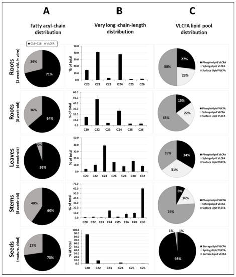 VLCFA content and distribution in Arabidopsis organs. (A) Distribution of long-chain (C16 and C18) fatty acids and VLCFA in Arabidopsis tissues (% of total); (B) VLCFA chain length distribution in Arabidopsis tissues (% of total); (C) Main lipid pools containing VLCFA in Arabidopsis tissues (% of total); Data for roots and stems were calculated from Delude et al. [60]. Note that for roots, the suberin polymer and soluble lipids were isolated and separately analyzed, while for stems waxes were first extracted, and waxes and dewaxed stem were separately quantified. For leaves and dried seeds global acyl-chain profiling, acyl-chain was released by transmethylation in 5% sulfuric acid in methanol for 3 h at 85 °C and silylated before GC analysis as for dewaxed stems in Delude et al. [59]. Unmodified C20 to C24 VLCFA were considered as phospho- or storage lipids, 2-hydroxy VLCFA as sphingolipids VLCFA, and typical waxes and suberin monomers as surface lipids VLCFA. For leaves and stems, the chain-length of the products from the decarbonylation pathway was considered as n + 1 (i.e., alkane C29 was counted in C30 VLCFA and derivatives).