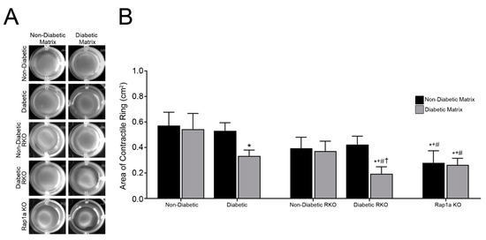 The formation of the contractile ring allowed the cardiac fibroblasts to modify their environment though changes in cellular contractile functions. In order to assess the change in cellular contractile function, the area of the contractile ring was measured for each sample (Figure 1A). The results determined that both types of matrix (non-diabetic and diabetic) and genetic make-up of cardiac fibroblast had a significant impact on the area of the contractile ring (Figure 1B; two-way ANOVA, Interaction p = 0.4226, Matrix p = 0.0463, and Genotype p = 0.0049). Non-diabetic fibroblasts embedded in both non-diabetic and diabetic matrices exhibited the largest contractile ring area, which was significantly greater than diabetic and diabetic RKO cells embedded in a diabetic matrix. There were no significant differences in areas of contractile rings between non-diabetic and non-diabetic RKO fibroblasts in either matrix. Diabetic RKO cells had a smaller contractile ring area than both diabetic and diabetic RKO cells embedded in non-diabetic matrix. Lastly, Rap1a KO cells displayed a smaller contractile area than non-diabetic cells in both non-diabetic and diabetic matrices, as well as diabetic cells in non-diabetic matrix. The results suggest that the presence of AGE/RAGE signaling and Rap1a expression affected the area of the contractile ring, and therefore cellular contraction.