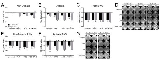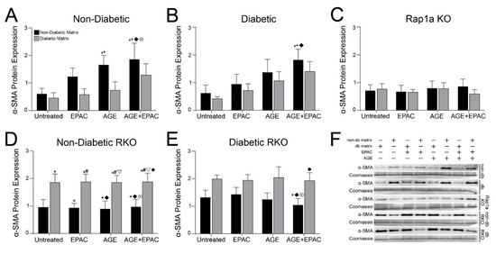 Statistical analysis was conducted using Graph Prism software, version 9.0.0. Both one-way and two-way ANOVAs were used to determine significance between variables. A one-way ANOVA was used for Figure 7 and Supplementary Figure S2, while a two-way ANOVA was used for Figures 1–6 and 8. A two-way ANOVA provided three p values which distinguished whether variables had an independent effect or whether an interaction between the variables had a significant impact. The variables for Figures 1 and 3 were collagen matrix and genotype, and the variables for Figures 2, 4–6 and 8 were collagen matrix and treatment. Following the ANOVA, a Fisher’s Least Significant Difference post hoc was conducted to determine significant differences between specific groups/treatments. All values presented within the graphs represent mean ± SEM. Symbols on graphs that denote significance are similar across graphs that depict similar data. Graphs that compared between different genotypes (Figures 1, 3 and 7) used the following symbols to denote which groups were compared: *, vs. non-diabetic cells in non-diabetic matrix; +, non-diabetic cells in diabetic matrix; #, diabetic cells in non-diabetic matrix; ◆, vs. diabetic cells in diabetic matrix; ▽, vs. Rap1a KO cells in non-diabetic matrix; ⊗, Rap1a KO cells in diabetic matrix; •, non-diabetic RKO cells in non-diabetic matrix; and †, vs. diabetic RKO in non-diabetic matrix. Graphs that compared between different treatment groups (Figures 2, 4–6 and 8) used the following symbols to denote which groups were compared: *, vs. untreated in non-diabetic matrix; +, vs. untreated in diabetic matrix; #, vs. EPAC in non-diabetic matrix; ◆, vs. EPAC in diabetic matrix; ▽, vs. AGE in non-diabetic matrix; ⊗, vs. AGE in diabetic matrix; •, vs. AGE+EPAC in non-diabetic matrix; and †, vs. AGE+EPAC in diabetic matrix.