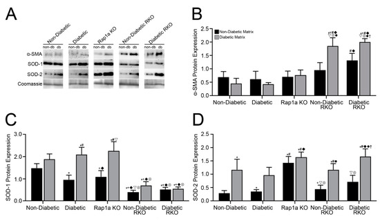 In contrast to the pattern noted for α-SMA, expression of SOD-1 was higher in cardiac fibroblasts wildtype for RAGE and Rap1a. This finding was further exacerbated when cells were embedded in a diabetic matrix (Figure 3C; two-way ANOVA, Interaction p = 0.0424, Matrix p < 0.0001, and Treatment p < 0.0001). Non-diabetic, diabetic, and Rap1a KO cardiac fibroblast embedded in diabetic collagen matrix exhibited significantly more SOD-1 compared to non-diabetic and diabetic RKO fibroblasts embedded in either non-diabetic or diabetic matrices. Furthermore, diabetic and Rap1a KO cells both displayed significant differences in SOD-1 expression when embedded in a diabetic matrix compared to a non-diabetic matrix.
