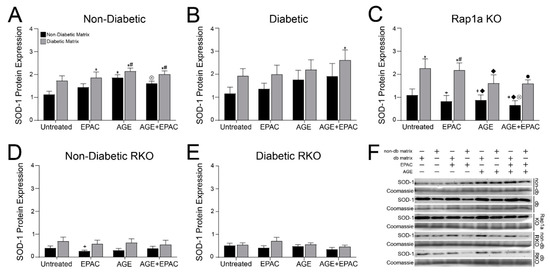 AGEs within diabetic collagen induced changes in SOD-1 expression utilizing both the AGE/RAGE signaling cascade and Rap1a. Cardiac fibroblasts from (A) non-diabetic, (B) diabetic, (C) Rap1a KO, (D) non-diabetic RKO, and (E) diabetic RKO were embedded in non-diabetic (black bars) and diabetic (grey bars) matrices. Protein expression was assessed by Western blot analysis for SOD-1 (23 kDa) and normalized to total protein (Brilliant Blue Coomassie Stain) in untreated, EPAC (100 µM), exogenous AGEs (0.05 mg/mL), and EPAC+exogenous AGEs (100 µM and 0.05 mg/mL, respectively) cardiac fibroblasts. (F) Representative Western blot images for SOD-1 protein expression and non-db = non-diabetic matrix and db matrix = diabetic matrix. Data are means ± SEM with n = 5–10. Statistical analysis consisted of a two-way ANOVA followed by a Fisher’s Least Significant Difference post hoc. Symbols above each bar indicate significance between a specific group (p < 0.05; * vs. untreated in non-db, + vs. untreated in db, # vs. EPAC in non-db, ◆ vs. EPAC in db, ⊗ vs. AGE in db, and • vs. AGE+EPAC in non-db). Untreated treatment groups presented were initially presented in Figure 3C.