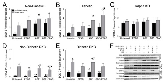Diabetic matrix and AGE/RAGE signaling impacted expression of SOD-2 in cardiac fibroblasts. Isolated cardiac fibroblasts from (A) non-diabetic, (B) diabetic, (C) Rap1a KO, (D) non-diabetic RKO, and (E) diabetic RKO mouse hearts and embedded in non-diabetic (black bars) and diabetic (grey bars) matrices. Quantification of Western blot analysis for SOD-2 (25 kDa) was conducted and normalized to total protein (Brilliant Blue Coomassie Stain) in EPAC (100 µM), exogenous AGEs (0.05 mg/mL) and EPAC+exogenous AGEs (100 µM and 0.05 mg/mL, respectively) cardiac fibroblasts. (F) Representative Western blot images for SOD-2 protein expression in cardiac fibroblasts and non-db = non-diabetic matrix and db matrix = diabetic matrix. Data are means ± SEM with n = 5–10. Statistical analysis consisted of a two-way ANOVA followed by a Fisher’s Least Significant Difference post hoc. Symbols above each bar indicate significance between a specific group (p < 0.05; * vs. untreated in non-db, + vs. untreated in db, # vs. EPAC in non-db, ◆ vs. EPAC in db, ▽ vs. AGE in non-db, ⊗ vs. AGE in db, and • vs. AGE+EPAC in non-db). Untreated treatment groups presented were initially presented in Figure 3D.