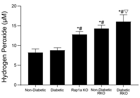 The level of oxidative stress within cardiac fibroblasts was assessed by measuring the concentration of hydrogen peroxide (H2O2), which was measured in untreated cardiac fibroblasts embedded in a non-diabetic matrix (Figure 7). Both RKO and Rap1a KO cardiac fibroblasts exhibited significantly more H2O2 (Figure 7; one-way ANOVA p < 0.0001). Non-diabetic and diabetic fibroblasts had significantly less H2O2 compared to Rap1a KO, non-diabetic RKO, and diabetic RKO cells. In addition, diabetic RKO cells had significantly higher levels of H2O2 compared to Rap1a KO cells.
