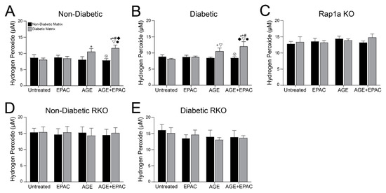 AGE/RAGE signaling and Rap1a expression impacted hydrogen peroxide levels in cardiac fibroblasts. Cardiac fibroblasts isolated from (A) non-diabetic, (B) diabetic, (C) Rap1a KO, (D) non-diabetic RKO, and (E) diabetic RKO mouse hearts. Fibroblasts were embedded in non-diabetic (black bars) and diabetic (grey bars) matrices for 7 days and treated with EPAC (100 µM), exogenous AGEs (0.05 mg/mL) and EPAC+exogenous AGEs (100 µM and 0.05 mg/mL, respectively). Protein lysates were collected and assessed for hydrogen peroxide concentration. Mean ± SEM were graphed with n = 5–10 and statistical analysis consisted of a two-way ANOVA, followed by a Fisher’s Least Significant Difference post hoc. Symbols above each bar indicate significance between a specific group (p < 0.05; * vs. untreated in non-db, + vs. untreated in db, # vs. EPAC in non-db, ◆ vs. EPAC in db, ▽ vs. AGE in non-db, ⊗ vs. AGE in db, and • vs. AGE+EPAC in non-db). Untreated treatment groups embedded in non-diabetic collagen were initially presented in Figure 7.