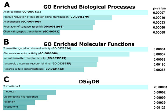The top five significantly enriched gene ontology terms associated with RTGs as determined by the EnrichR software. (A) Biological processes, (B) molecular functions, and (C) Drug Signatures Database (DSigDB). Pathways are presented based on the combined EnrichR score. DSigDB relates drugs/compounds to their target genes.