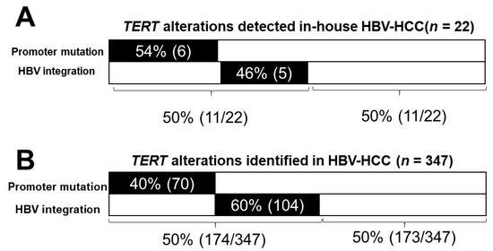 TERT hotspot promoter mutations (−124, −146) are the most frequently reported mutations in HCC, found in about 50% of cases [101,102,103,104,105,106]. In HBV–HCC, up-regulation of TERT expression could also be caused by HBV integration at or near the TERT promoter region [28,29,30,32,38,48]. Therefore, we next compared the frequencies of TERT promoter mutation and HBV integration. For our in-house cohort (n = 22), shown in Figure 4A, promoter mutations were found in 6 of 22 samples, and integrations in the TERT gene were found in 5 of 22 samples in a mutually exclusive fashion. Together, TERT alterations were detected in 50% (11/22) of this cohort. To determine if this mutual exclusivity applied to a larger sample size, we examined TERT alterations identified by us and others [40,42,45] together, as summarized in Figure 4B. Of the 347 HBV–HCC patients, 174 (50%) were found to have detectable TERT alterations. Promoter mutations and HBV integrations were mutually exclusive and comprised 40% (70/174) and 60% (104/174) of all alterations, respectively.