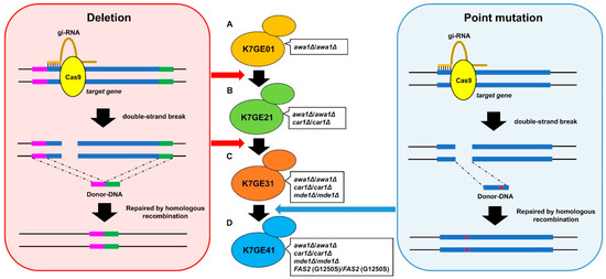 Serial breeding of a sake yeast strain with eight mutations. A double-strand break was introduced in the target gene by CRISPR-Cas9. Homologous recombination repair was performed using donor DNA (150 bp) to introduce gene deletion (light red region) or point mutation (light blue region). Starting from K7GE01 (yellow) with AWA1 deletion (A), K7GE21 (green) with CAR1 deletion (B), K7GE31 (orange) with MDE1 deletion (C), and K7GE41 (blue) with FAS2 (G1250S) point mutation (D) were generated successively. The final K7GE41 sake yeast strain harbored homozygous eight mutations that confer excellent brewing characteristics.