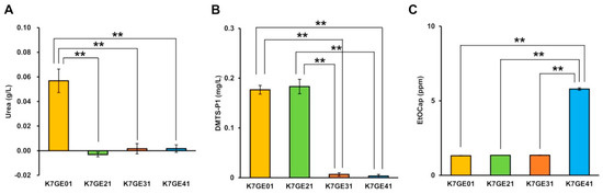 Measurement of urea (A), dimethyl trisulfide-P1 (DMTS−P1) (B) and ethyl caproate (C) in sake made with genome-edited strains. Error bars indicate standard error (n = 3). Asterisks indicate Tukey’s multiple comparison test (** p < 0.01).